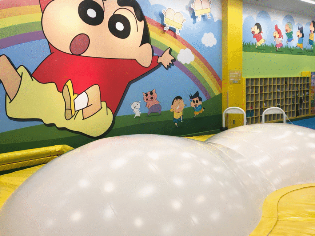 施設内には、人気アニメクレヨンしんちゃんの世界観をテーマにした遊び場が広がり、子どもたちが体を動かして遊べる遊具や、しんちゃんの世界を感じられるエリアなどが用意されています。雨の日でも安心して遊べる屋内施設のため、家族でのお出かけ先としても人気のスポットです。